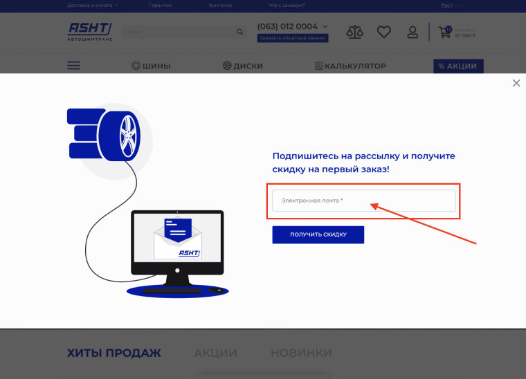 - В открывшемся окне заполните поле «Ваш E-mail» нажмите кнопку «Получить скидку».