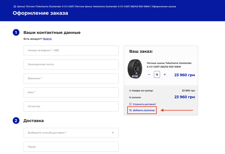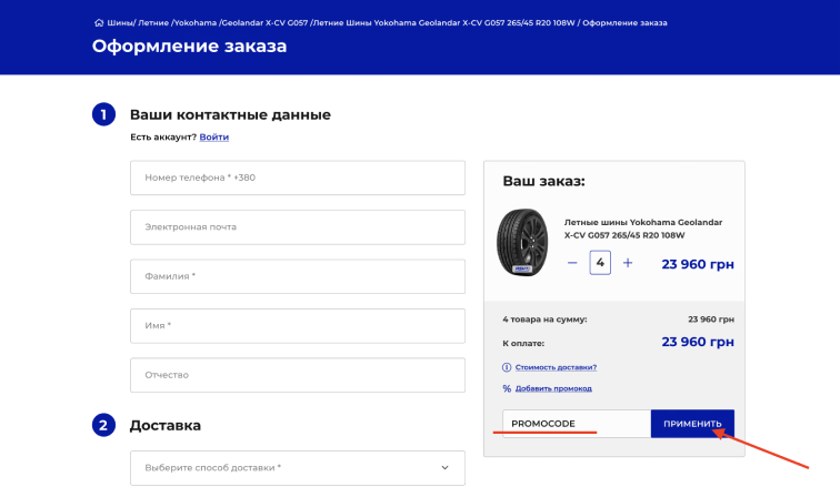 - На странице оформления заказа заполните все обязательные поля формы. С правой стороны вы найдите кликабельную надпись «Использовать промо-код». Нажмите на нее..